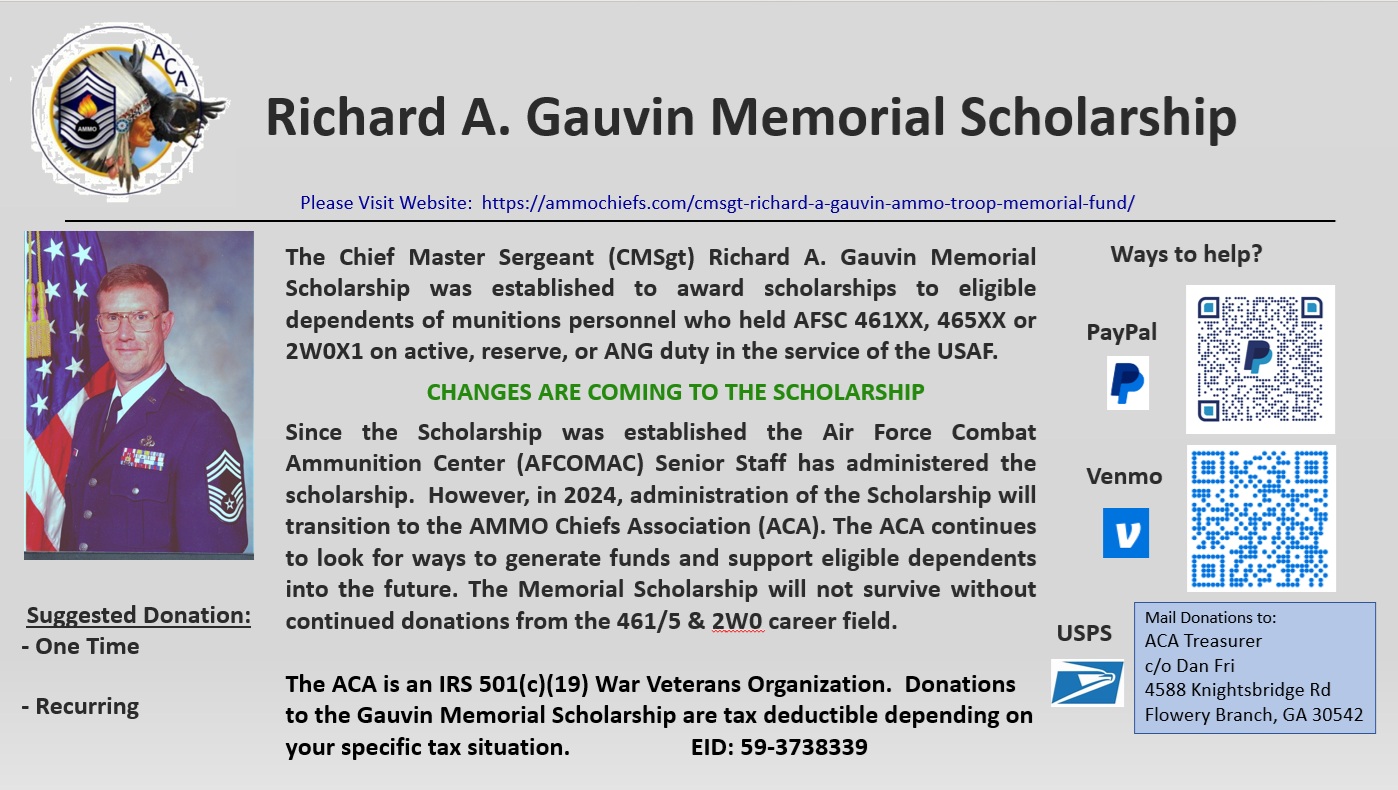 The AMMO Chiefs Association (ACA) Board of Directors manages and administers the CMSgt Richard Gauvin Scholarship.  AFCOMAC and the MAJCOM AMMO Chiefs are no longer involved.